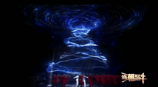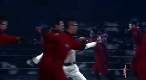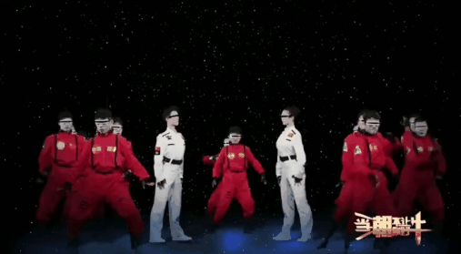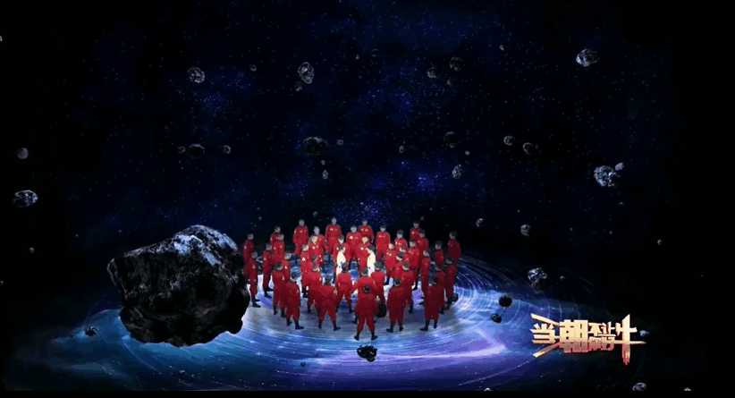 节目开始,两位主演身着航天服与一群身穿红色衣服的表演者,在星河陨石中,起手舞太极。