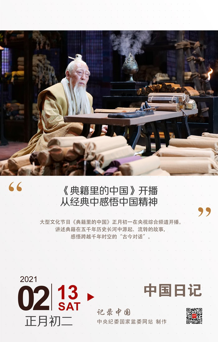 2月12日,大型文化节目《典籍里的中国》在央视综合频道开播。节目以影视化的方式,讲述典籍在五千年历史长河中源起、流转的故事,实现“护书人”与“读书人”跨越千年时空的“古今对话”。