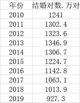 实际上,结婚人数也是一个重要参照。数据显示,2013年我国各级民政部门和婚姻登记机构共依法办理结婚登记1346.9万对,不过在经历这一近十年的历史高位后,其后六年连续减少。2019年全国婚姻登记机关共办理结婚登记947.1万对,首次跌破1000万对,比2013年减少了400万对,下降了三成。