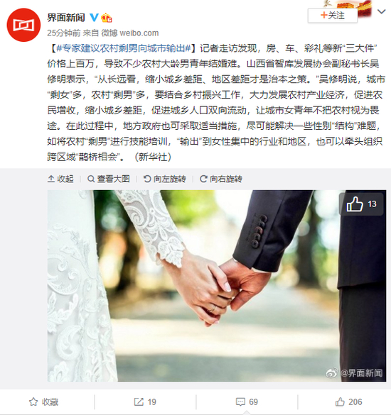 记者走访发现,房、车、彩礼等新“三大件”价格上百万,导致不少农村大龄男青年结婚难。山西省智库发展协会副秘书长吴修明表示,“从长远看,缩小城乡差距、地区差距才是治本之策。”吴修明说,城市“剩女”多,农村“剩男”多,要结合乡村振兴工作,大力发展农村产业经济,促进农民增收,缩小城乡差距,促进城乡人口双向流动,让城市女青年不把农村视为畏途。在此过程中,地方政府也可采取适当措施,尽可能解决一些性别“结构”难题,如将农村“剩男”进行技能培训,“输出”到女性集中的行业和地区,也可以牵头组织跨区域“鹊桥相会”。(新华社)