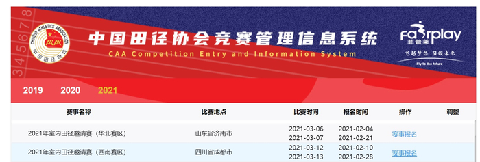 在公布的2021年赛事计划中,春节之后国内的第一项田径赛事是2021年室内田径邀请赛(华北赛区),将于3月6日在济南举行。3月12日室内田径邀请赛(西南赛区)也将在成都举行。中国田协官网已经开启了两项赛事的报名系统,这意味着田径国内赛事即将重启。