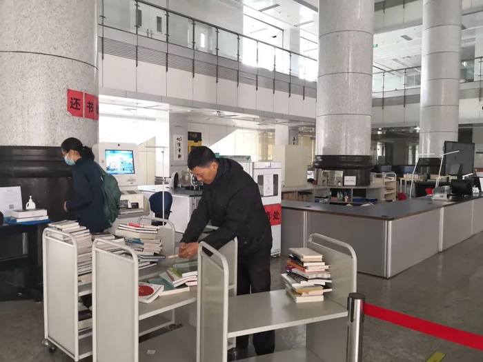 流通部工作人员正在处理归还的图书