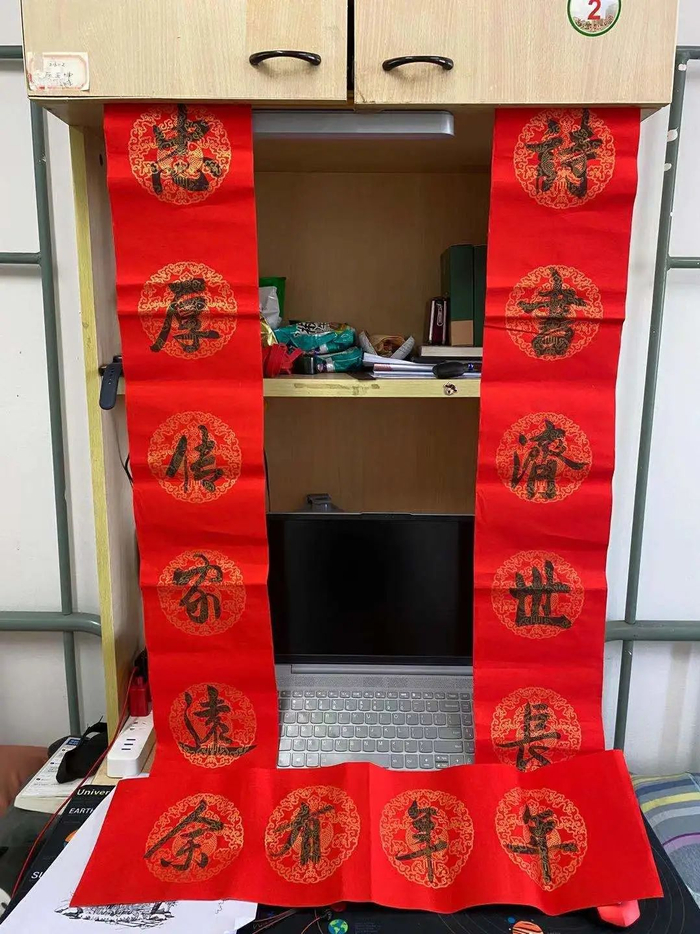 留校的2018级水务工程专业马同学说,她家是吉林白山的,家乡疫情相对严重,所以选择了春节留校。宿舍也只有自己一个人,但是通过留校学生微信群了解到学校举办的击剑活动,就报名参加了。“本次活动是全运会冠军‘1442工程’击剑队教练王玲老师来指导教学的,我之前没有击剑的基础,第一次体验击剑觉得很有意思。”马同学说自己还写了一幅对联贴上,让自己在学校过年也有浓浓的仪式感。