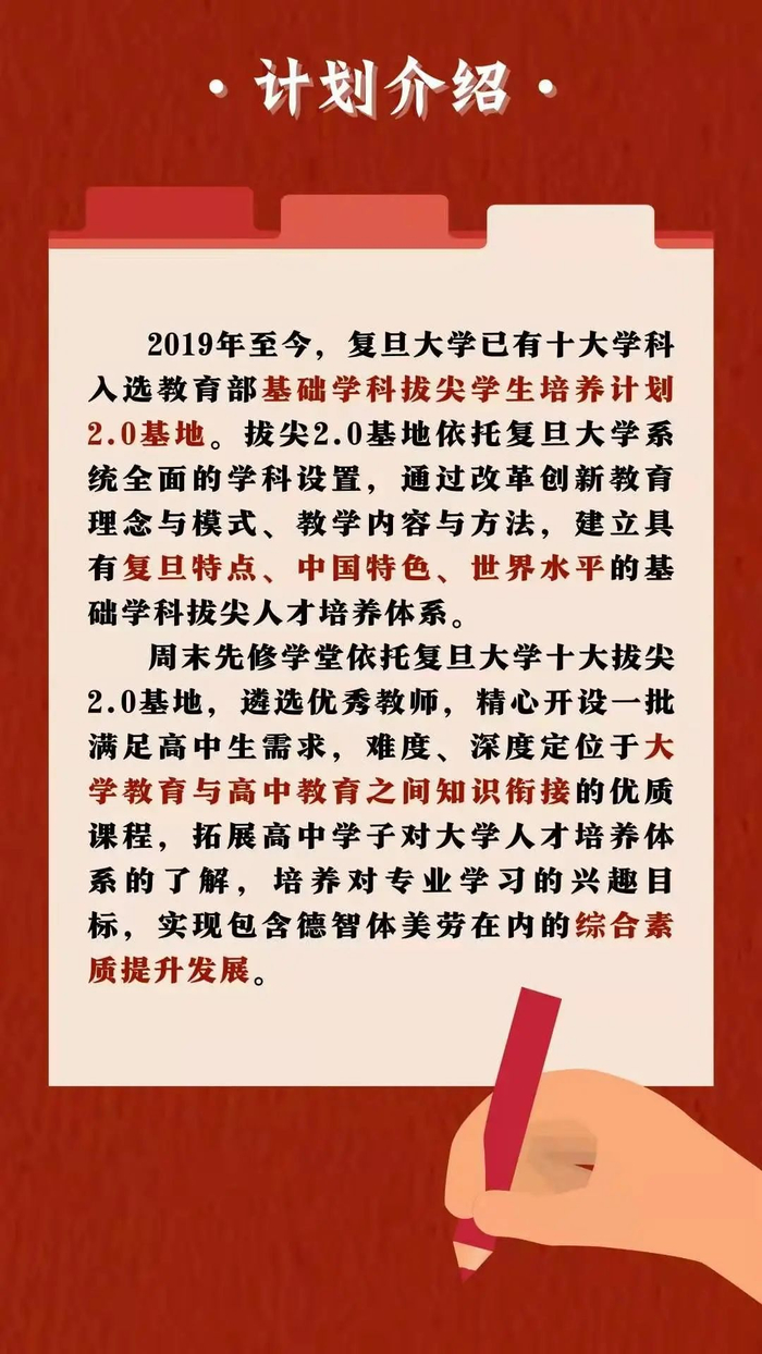 设立周末先修学堂,旨在充分利用和发挥复旦大学学科全面,根基深厚的综合性研究型大学人才培养教育优势,助力中学教育增强学生综合素质,引导学生培养综合能力,培养创新思维,增长知识见识,增强综合素质,努力成长为担当民族复兴大任的时代新人。