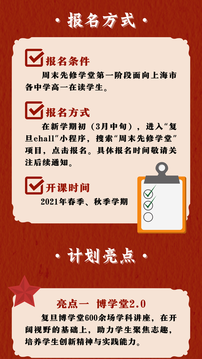 在三月中旬,复旦大学将开放周末先修学堂报名系统,各位高中生可关注复旦大学官方网站,及时获悉报名的相关通知。