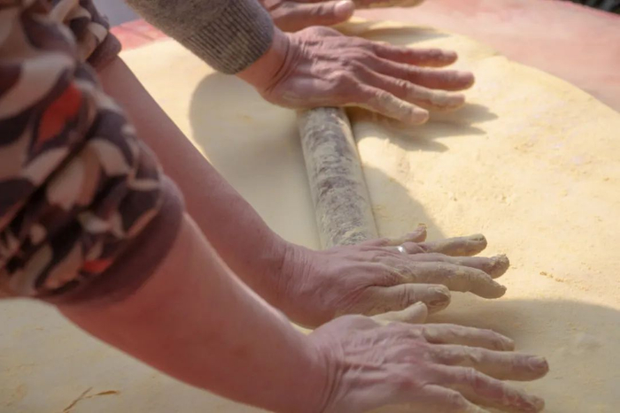 宁波的年糕家喻户晓,事实上,麻糍同样是宁波的年俗名点。在捣麻糍的前一天,将当年的糯米浸入水中,用一夜时间使其充满水分。次日,将以浸泡完全的糯米研磨成粉,放入一底部铺有竹制蒸屉的木桶蒸制,蒸熟的糯米粉撒上些许盐,已是孩子们最爱吃的美食。将事先汆好的艾草以及盐混入正热乎的糯米粉中,转移至一用整块青石打制而成的石臼中,捣麻糍的村民分工协作,一人手持传统青石制的捣锤或较轻的木制捣锤,一人不断将底部的麻糍上翻并在底部添水防止粘连。糯米粉尚热,连续锤捣至糯米粉完全粘连、艾草和糯米粉混合均匀,立即转至铺满松花粉的米篓上,再涂满松花,压至饼状,切块即可。可长时间保存,食用时两面烤至微焦即可。清新、香甜、软糯。