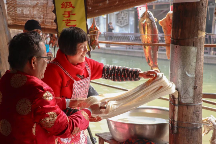 扯白糖是安昌古镇当地很具特色的小吃之一,这门手艺从明清传承下来,粗大的糖条在扯糖师傅手里上下翻飞,制作出的白糖不仅好看,也很好吃,甜如蜜、入口即化。