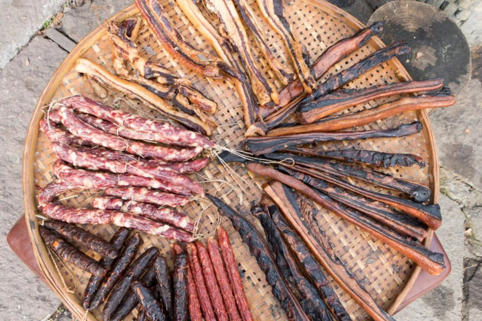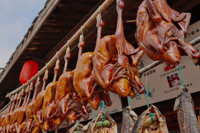 绍兴安昌古镇,是传统的江南水乡。其酱肉腊肉独有特色。使用安昌酿造的酱油作为原料,冬季制作的品质为最佳,过年期间,除了将当地居民手工制作的腊肉酱肉挂在自家门口晾晒,还有社戏表演等年俗活动。