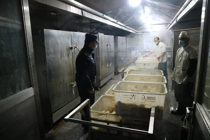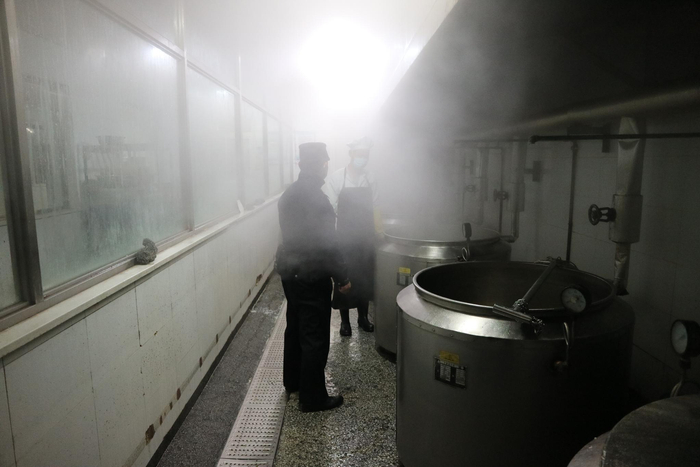 把控食品质量、让服刑人员吃得卫生,是司务长的职责所在,“不怕一万,就怕炊场服刑人员睡眼朦胧时,发生安全事故”,所以他细致检查,一刻都不敢放松。当看到整个烹饪过程没有出现丝毫疏漏时,他松了一口气,又拿起测量仪器,开始对早餐进行精准分配。“我们的所有执法都要体现公平与正义,也要有科学依据,所以监狱实行分餐制管理,这也是一门大学问。”