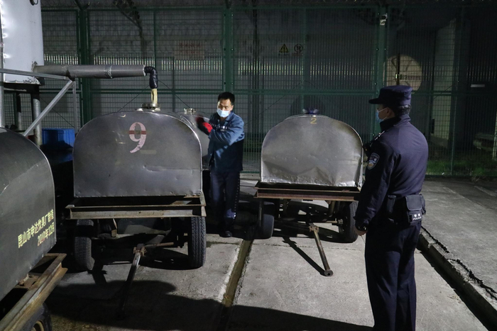这时,配送原料的菜车到了,张恒国利索地穿起隔离服,验收防疫检测证书、来料质量,严格把控保质期,随后仔细登记数量,将来料分类入库,保证储存安全。“现在是特殊时期,我们每天都会把食材样本进行复核检测,确保安全卫生。”