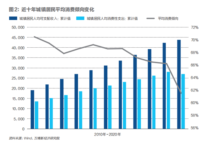 有关消费倾向的研究表明,中国居民的平均消费倾向(人均消费支出占可支配收入的比重)从1990年的0.85以上,已经下降到疫情暴发前的0.70左右,其中农村居民的平均消费倾向大约为0.73,城镇居民的平均消费倾向为0.66。从变化趋势上看,自2008年以来下行趋势有所加速,2020年疫情期间居民平均消费倾向再创历史低点,其中城镇居民平均消费倾向已经下滑到不足0.62。
