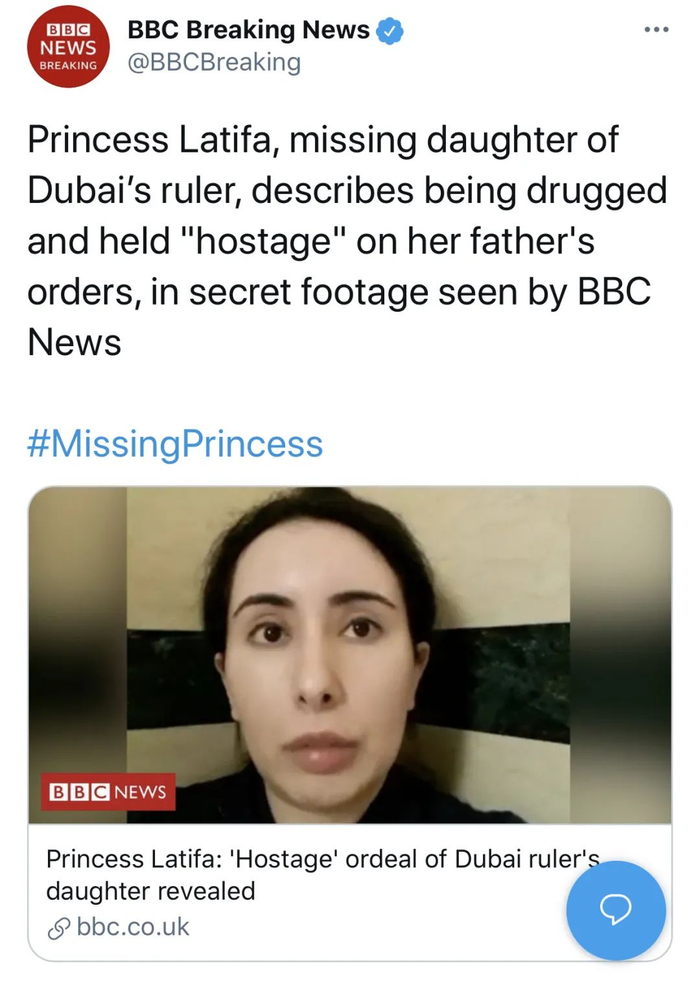 虽然拉蒂法公主本人被带回来了,但由于公主之前发布的视频传播范围太广,迪拜王室也面临着很大的舆论压力。