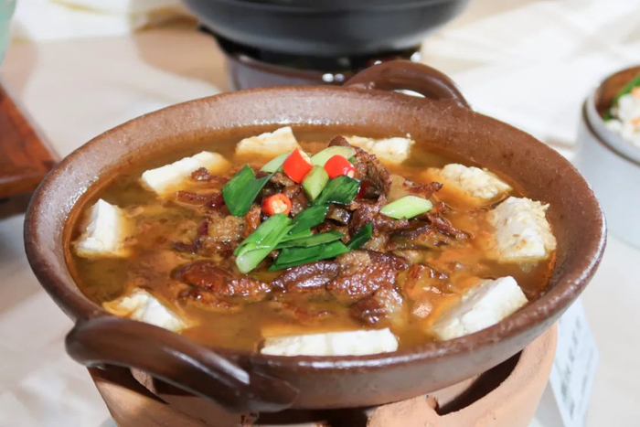 风炉宴讲究食材搭配,荤与素、腊味与时令、跨域春冬的结合孕育出了“完美搭档”的味觉效果。它不像川渝火锅一般随烫随吃,而是要将事先炒制好的食材汇于一锅,在盛放着木炭的风炉内小火慢煨,食物在慢煨的过程中保留了菜肴原有的锅气。