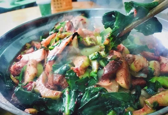与其说是火锅,倒不如说是干锅,绿油油的庆元油菜、黄澄澄的油豆腐、软弹弹的香菇、白花花的笋和五花肉,在酒精炉灶的烧灼下咕嘟嘟冒着热气,成了一道独具庆元特色的菜品。