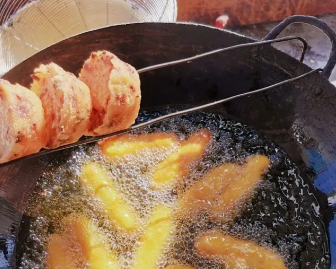 云和油筒饼色泽金黄,外酥里嫩。制作时,将米浆倒入特制的模具,包入萝卜丝、南瓜丝、香葱等炸制而成,是云和一道传统小吃。