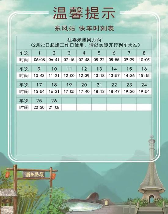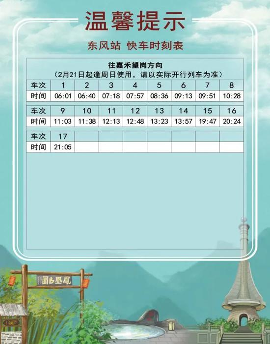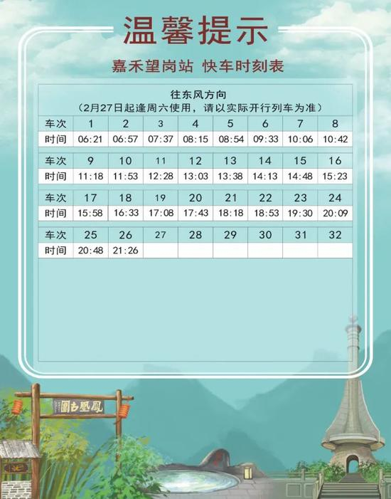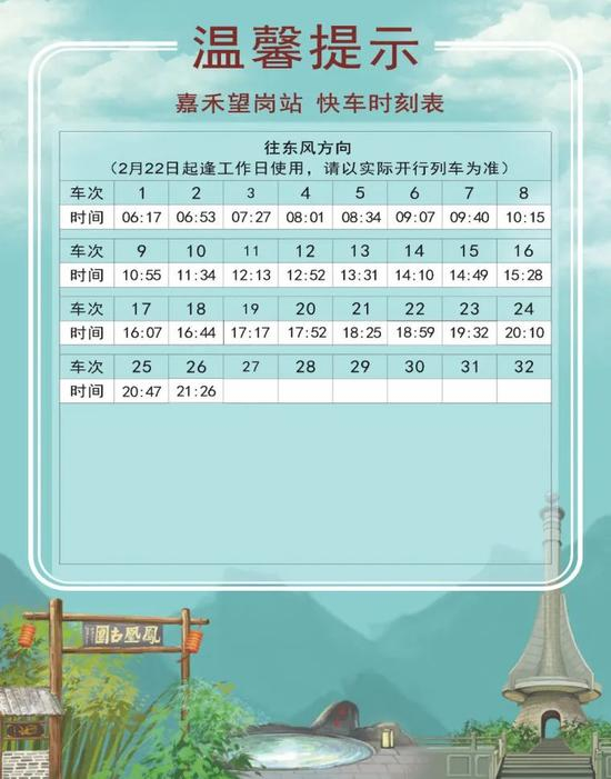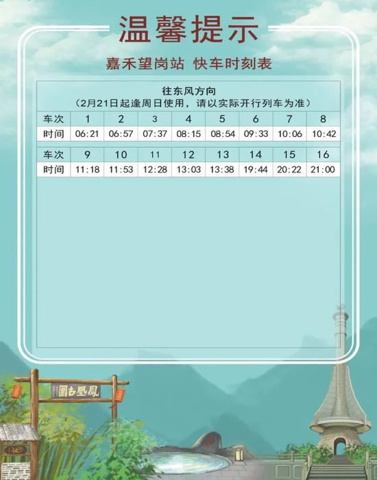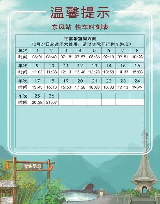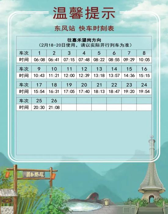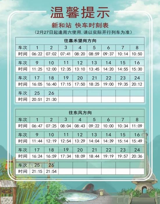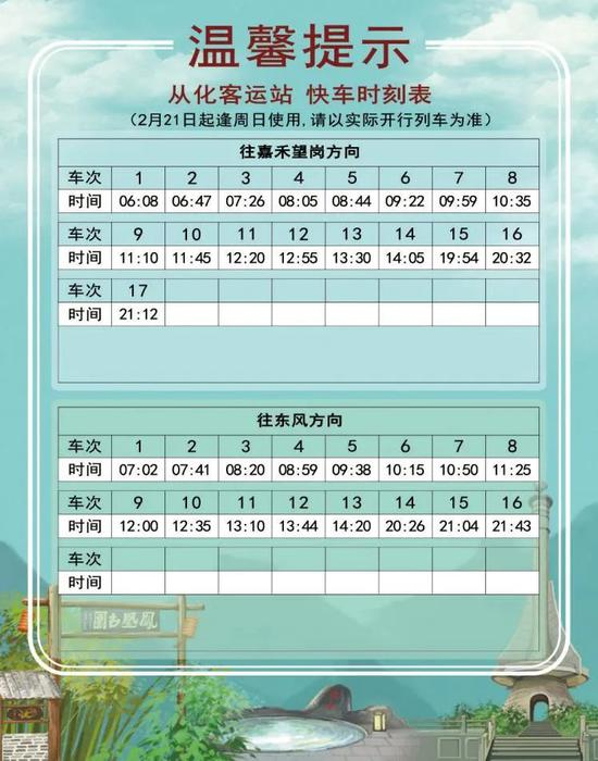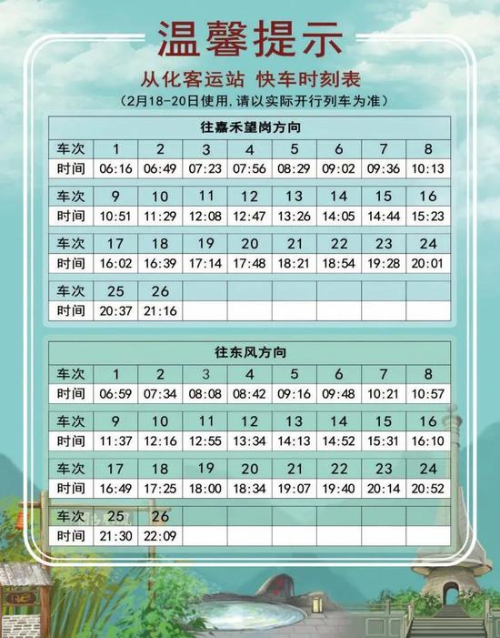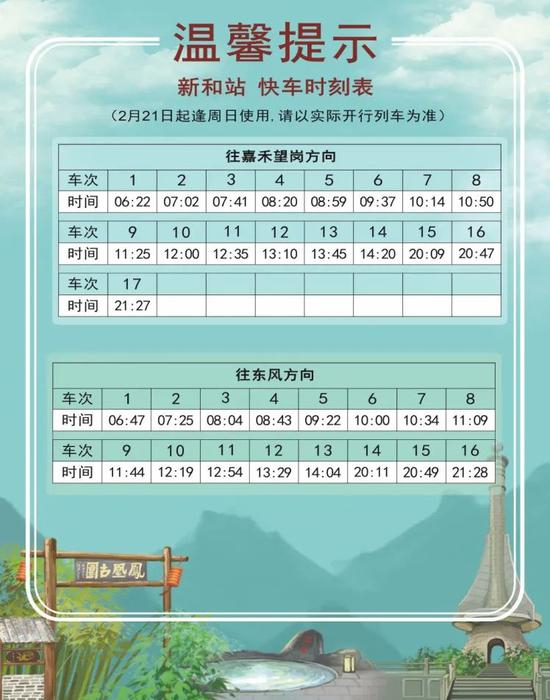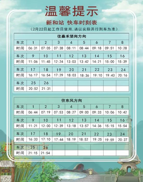 2 月 18 日起,十四号线对快车时刻表进行了调整。新的时刻表分为2月18日-20日、2月21日起逢周日使用、2月22日起逢工作日使用、2月27日逢周六使用共四个不同的版本。大家乘车时一定要注意日期哟!同时,快车的实际时间会根据运营情况有所调整,此时刻表仅做参考,搭乘时请以车站现场广播和电视上的列车信息为准。