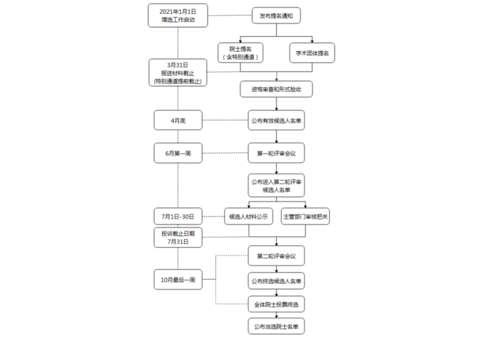 院士提名方面,每次增选每位院士至多可提名3位候选人。院士要对提名行为负责。候选人获得3位院士的提名方为有效,且仅能接受3位院士的提名,其中本学部院士应不少于2位。年龄超过65周岁的候选人,获得6位院士的提名方为有效,且仅能接受6位院士的提名,其中本学部院士应不少于4位。