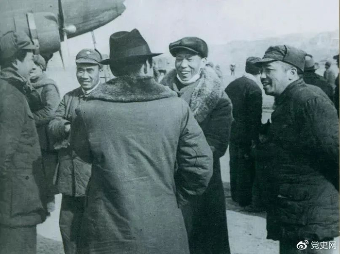 1946年2月19日,周恩来从重庆返回延安汇报工作。毛泽东等在延安机场迎接周恩来。