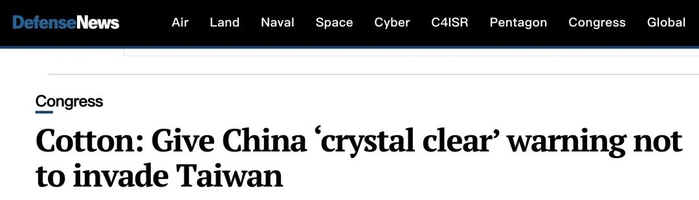 此外,报道提到,科顿还鼓吹说美国要改变“战略模糊”,如果中国改变台海现状,美国应“伸出援手”。此外,他还提出了一系列“冷战式”言论,声称要制裁从美国“偷窃知识产权”的中国公司,并且还要鼓动盟友们一起这么做。“有些国家会比另一些国家难以拉拢,正如冷战当中一样。”科顿这样说道。