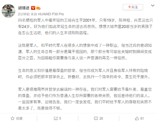 胡锡进:边境冲突4名牺牲军人最年轻的是00后 为他们逝去悲伤