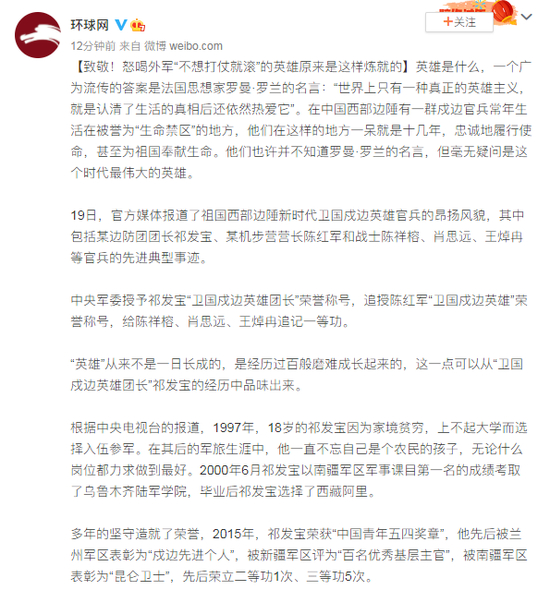 19日,官方媒体报道了祖国西部边陲新时代卫国戍边英雄官兵的昂扬风貌,其中包括某边防团团长祁发宝、某机步营营长陈红军和战士陈祥榕、肖思远、王焯冉等官兵的先进典型事迹。