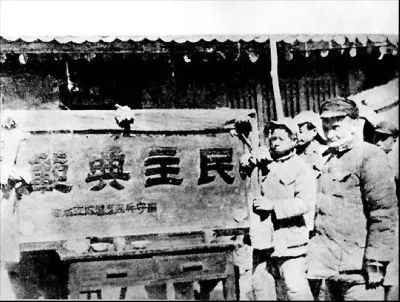 1941年11月,著名爱国民主人士李鼎铭提出了“精兵简政”的提案。12月17日,中共中央发出了“精兵简政”的指示,这个政策先后在陕甘宁和其他根据地积极施行,并取得了良好的效果。图为李鼎铭(右一)代表边区政府接受八路军留守兵团赠的“民主典范”牌匾。