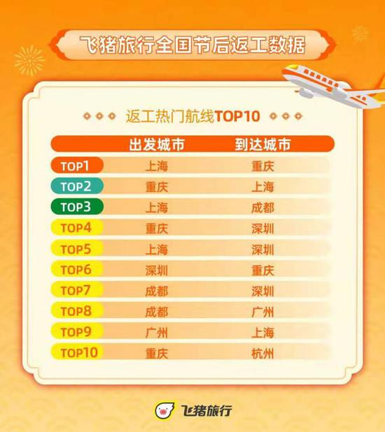 返工客流也带动了商旅酒店预订回升。飞猪数据显示,春节后经济连锁型酒店预订量相比春节期间增长超150%,上海、成都、广州、北京、杭州、深圳、重庆、西安、长沙、武汉是节后酒店入住的热门城市前十。
