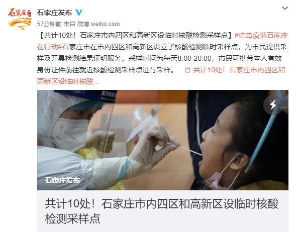原标题:石家庄市内四区和高新区设10处核酸临时采样点