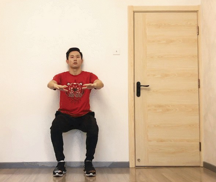 动作要领:双脚与肩同宽(不需要双脚并拢),双脚位置在身体前方,整个躯干紧贴墙壁(头不需要靠墙壁),膝盖弯曲90°,关键是保持小腿与地面垂直,如果出现小腿不与地面垂直,或者膝盖超过脚尖,不仅不能增强腿部力量,反而导致膝盖压力增加,越练越痛。