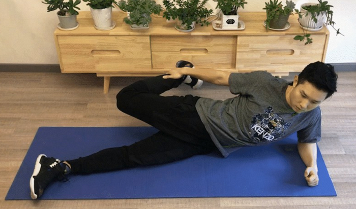 动作要领:侧卧于垫上,躯干伸展呈直线,小腿身体后侧弯曲,上侧手拉住同侧脚踝并向后拉。