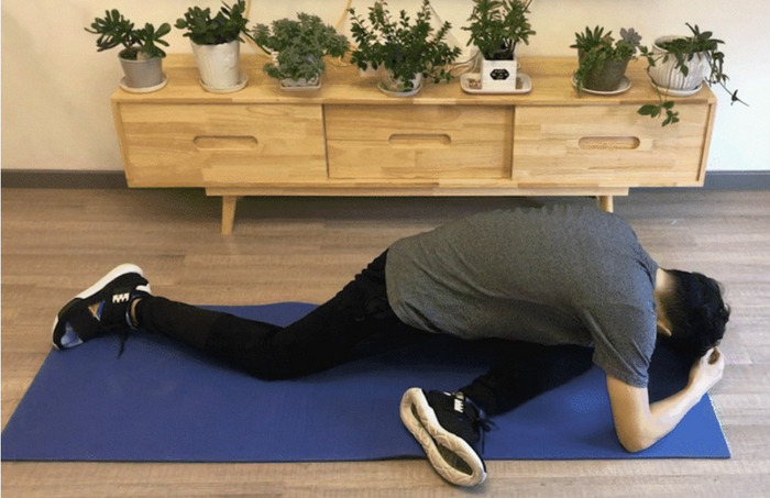 动作要领:俯卧于垫上,一侧腿膝盖弯曲至于胸部下方,另一侧腿向后伸直。