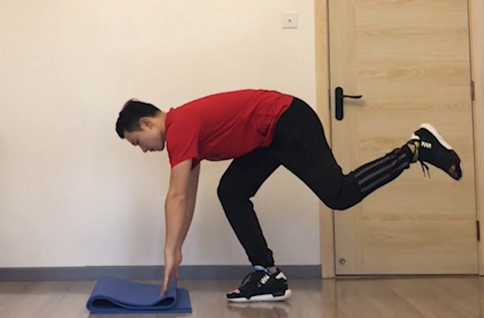 动作要领:单腿站立,躯干直背下降,双手前伸至触摸地面或障碍物。大腿后侧发力使躯干抬起,前脚掌发力跳起。