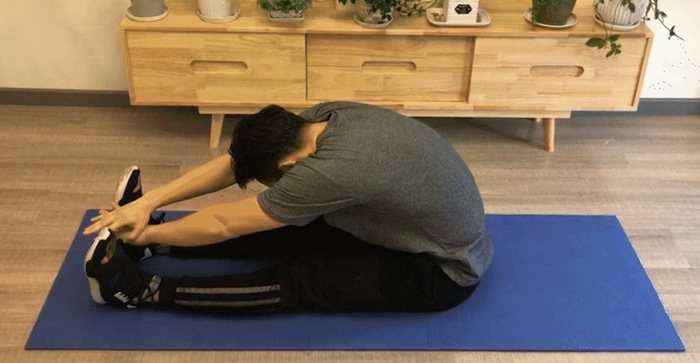 动作要领:双腿伸展,呈坐姿。双手摸脚踝。