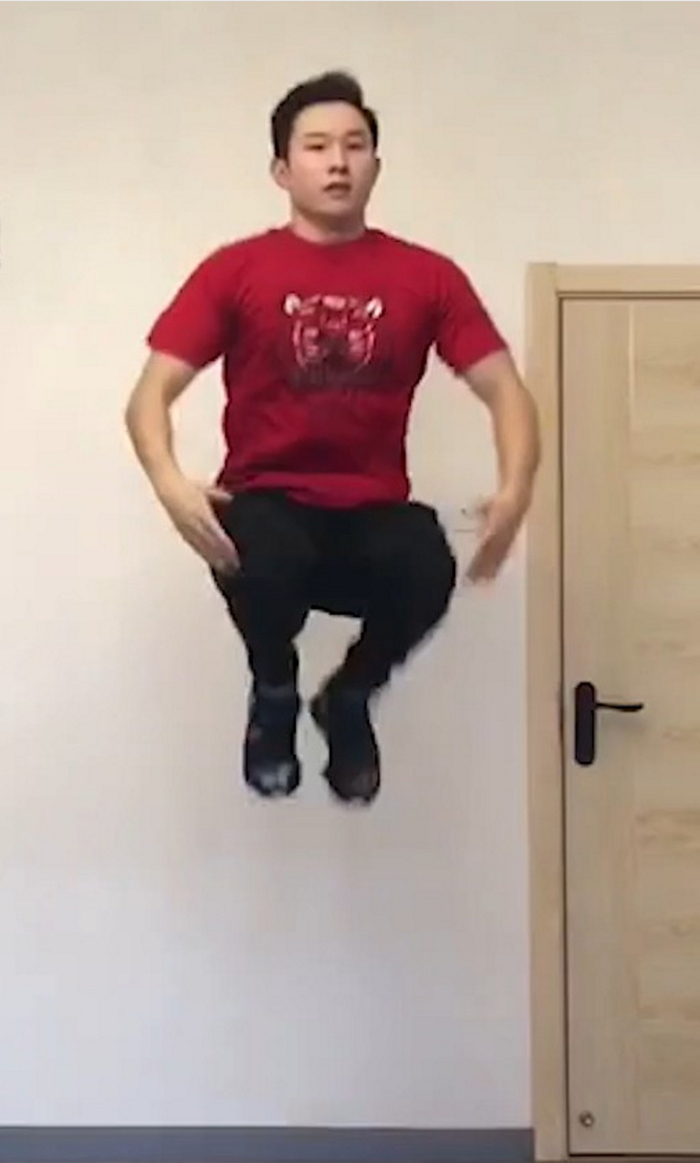 动作要领:双腿开立,与肩同宽,下蹲至大腿与地面平行,双手同时触摸同侧脚掌内侧,大腿发力使重心向上,双脚尽量跳高,落地要有缓冲。