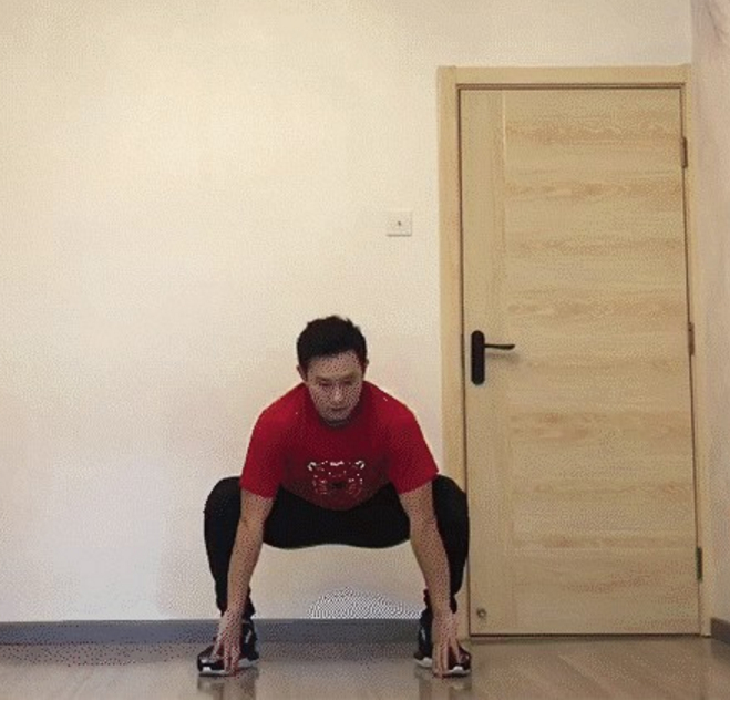动作要领:双腿开立,与肩同宽,下蹲至大腿与地面平行,双膝交替触地站立。