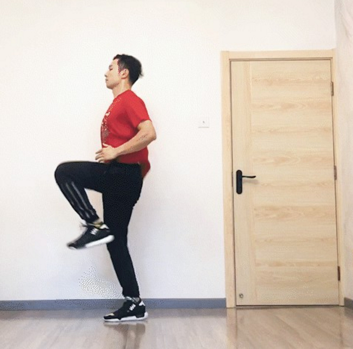 动作要领:挺胸收腹,落地屈膝缓冲;膝盖与脚尖保持向前,抬腿至略高于髋部;前脚掌着地发力。