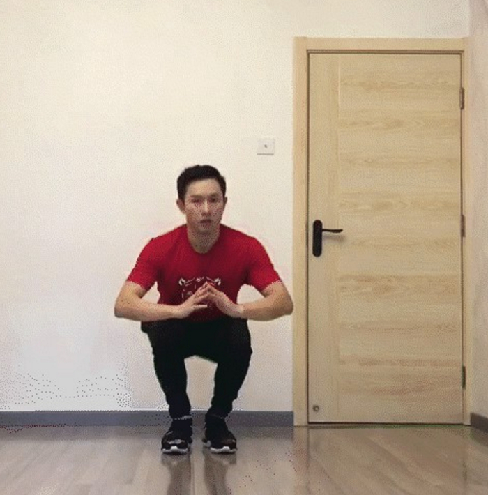 动作要领:双腿开立,与肩同宽,下蹲至大腿与地面平行,前脚掌发力跳起,双腿两肩间距,前脚掌发力双脚并拢。