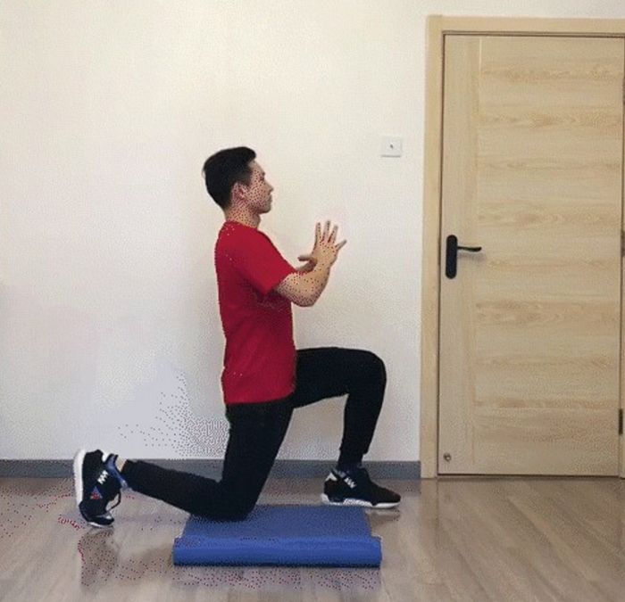 动作要领:单腿向前跨一步呈弓步,前腿小腿与地面垂直,重心放在后腿,后腿膝盖向下移至触地。后腿发力将身体重心抬至最高。