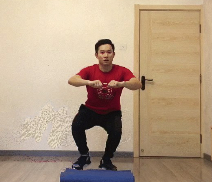 动作要领:双腿开立,与肩同宽,下蹲至大腿与地面平行,双脚前脚掌上勾,放平;双脚后脚跟上提。