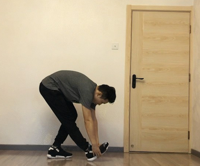 动作要领:站立,向前迈一步,前脚勾脚尖,后腿弯曲,双手摸前脚脚踝。