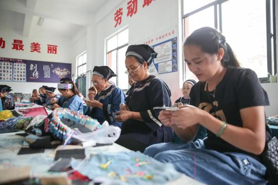 2020年11月23日,贵州66个贫困县已全部脱贫摘帽。至此,中国中西部22个省区市的832个贫困县全部实现脱贫摘帽。图为贵州省的绣娘在扶贫就业作坊绣制苗绣产品。