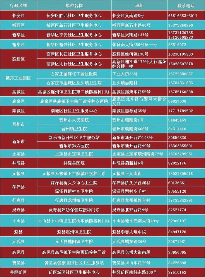 石家庄市出国人员接种单位信息一览表