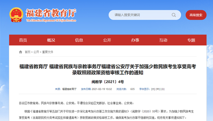 此前,福建省教育厅等五部门下发进一步深化高考加分改革工作实施方案,指出,福建省少数民族考生,加分分值从2021年起调整为5分,其中2021年至2023年,少数民族考生加分可面向所有高校投档时使用;2024年至2025年,少数民族考生加分仅面向省属高校投档时使用。2026年起取消少数民族考生加分政策。