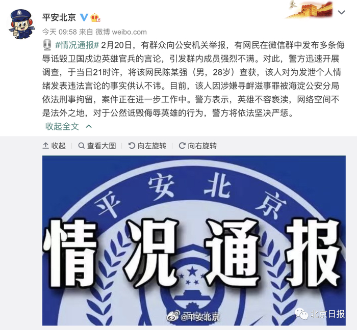 2月20日,有群众向公安机关举报,有网民在微信群中发布多条侮辱诋毁卫国戍边英雄官兵的言论,引发群内成员强烈不满。对此,警方迅速开展调查,于当日21时许,将该网民陈某强(男,28岁) 查获,该人对为发泄个人情绪发表违法言论的事实供认不讳。目前,该人因涉嫌寻衅滋事罪被海淀公安分局依法刑事拘留,案件正在进一步工作中。