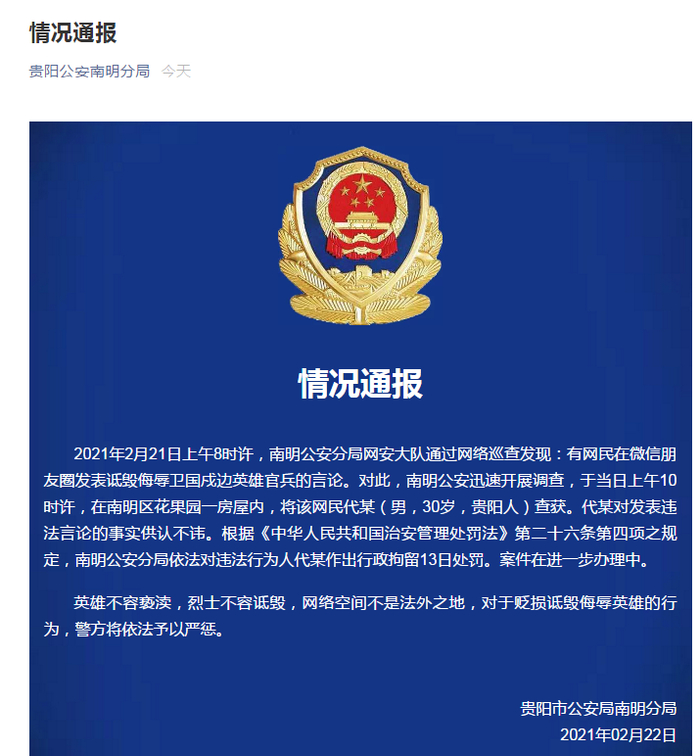 据贵州南明公安分局2月22日官方微信通报:2021年2月21日上午8时许,南明公安分局网安大队通过网络巡查发现:有网民在微信朋友圈发表诋毁侮辱卫国戍边英雄官兵的言论。对此,南明公安迅速开展调查,于当日上午10时许,在南明区花果园一房屋内,将该网民代某(男,30岁,贵阳人)查获。代某对发表违法言论的事实供认不讳。根据《中华人民共和国治安管理处罚法》第二十六条第四项之规定,南明公安分局依法对违法行为人代某作出行政拘留13日处罚。案件在进一步办理中。英雄不容亵渎,烈士不容诋毁,网络空间不是法外之地,对于贬损诋毁侮辱英雄的行为,警方将依法予以严惩。