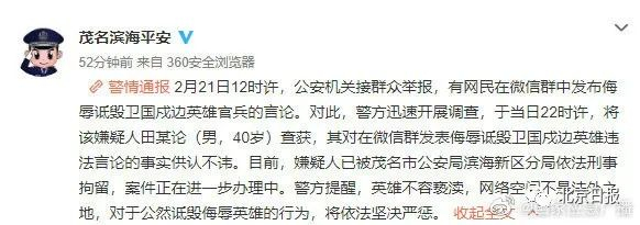 据广东省茂名市公安局滨海新区分局官博@茂名滨海平安 22日消息,2月21日12时许,公安机关接群众举报,有网民在微信群中发布侮辱诋毁卫国戍边英雄官兵的言论。对此,警方迅速开展调查,于当日22时许,将该嫌疑人田某论(男,40岁)查获,其对在微信群发表侮辱诋毁卫国戍边英雄违法言论的事实供认不讳 。目前,嫌疑人已被茂名市公安局滨海新区分局依法刑事拘留,案件正在进一步办理中。