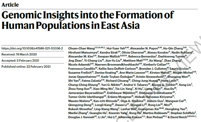 来源:厦门大学2021年2月22日,厦门大学人类学研究所、厦门大学生命科学学院细胞应激生物学国家重点实验室王传超教授课题组与哈佛医学院David Reich教授团队合作,联合全球43个单位的85位共同作者在Nature期刊上发表文章Genomic Insights into the Formation of Human Populations in East Asia,通过古DNA精细解析东亚人群形成历史。