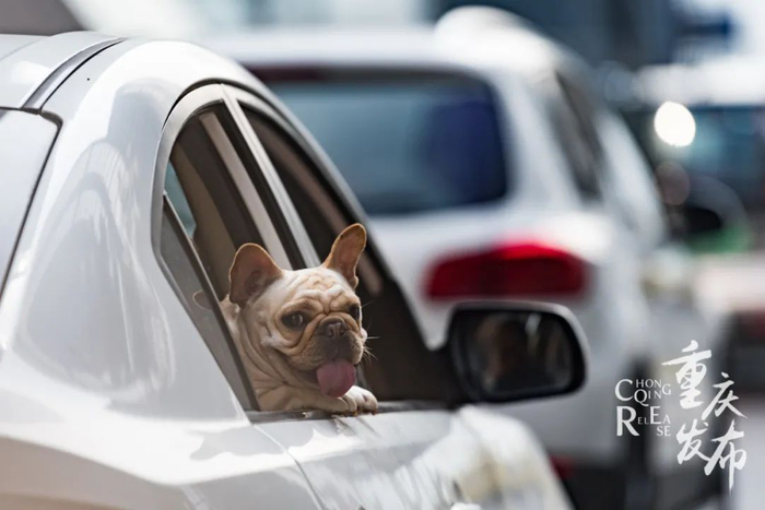 2月22日,重庆持续晴好天气,在等红绿灯的间隙,一只宠物狗头部探出车窗外“兜风”。邹乐 摄