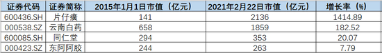 Wind数据显示,从2015年1月1日到2021年2月22日,同仁堂的市值从294亿元增长至353亿元,涨幅仅为20%。