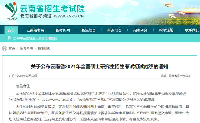【教育】速看!云南省2021年全国硕士研究生招生考试初试成绩通知已公布